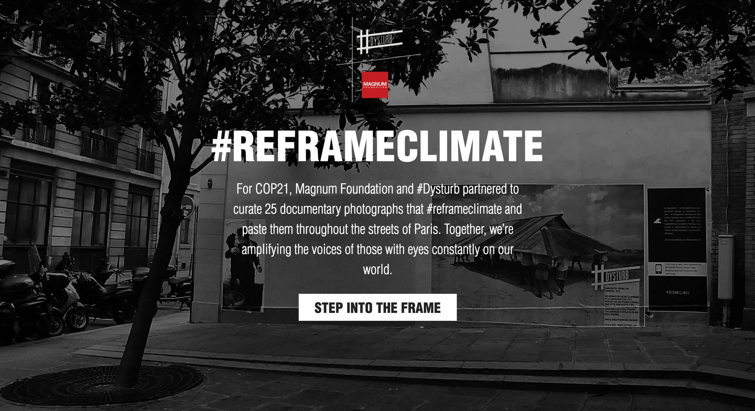Commissioned by the Magnum Foundation, and in collaboration with NYU's ITP and the Yale School of Forestry and Environmental Studies, #ReframeClimate is a 3D virtual reality web experience that recreates the wheat pastings of large-scale documentary photographs by #Dysturb photographers in the streets of Paris. It is a visual intervention for the COP21 Climate Change Campaign in Paris, France. The site launched in December 2015.
